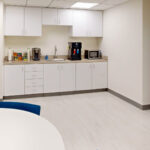 A full kitchen is available for members, furnished with a Keurig coffee maker, filtered water, a microwave, and a full-size refrigerator. Cleaning services are provided daily by the building.