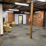 The Rochester office space includes a reception area to greet guests and manage arrivals. The mill building offers shared amenities, including a full kitchen.